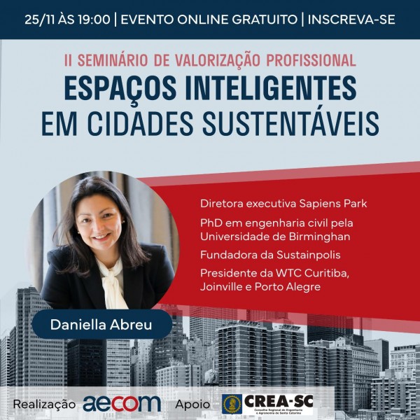 Daniella Abreu participará como palestrante do II Seminário de Valorização Profissional da AECOM, trazendo sua experiência para o debate “Espaços Inteligentes em Cidades Sustentáveis”. Daniella Abreu é fundadora da Sustainpolis, empresa especializada na promoção de parcerias para projetos internacionais no âmbito da construção e infraestruturas sustentáveis, e já atuou como Secretária de Estado para Assuntos Internacionais do Governo de Santa Catarina. Atualmente ocupa outro cargo público, atuando como Diretora Executiva do Sapiens Park. O evento é gratuito e aberto para todos, e contará com a participação de representantes do CREA-SC e do CAU/SC.